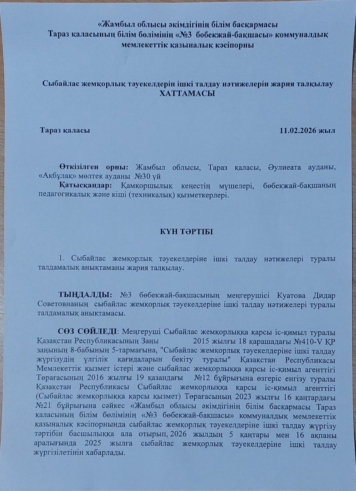11 февраль 2026 0 1 2 3 4 5 Сыбайлас жемқорлық тәуекелдерін ішкі талдау нәтижелерін жария талқылау Осы беттің QR-коды:QR-код этой страницы: